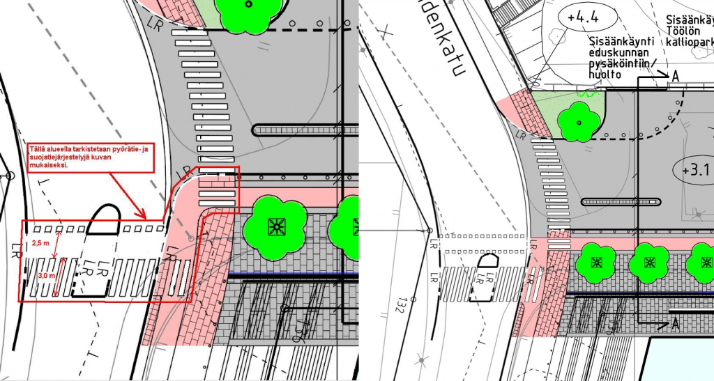 Toinen esimerkki: Itämerenkadun ja Länsisatamankadun risteys Ruoholahdessa tehtiin uusiksi ratikkakiskojen rakentamisen yhteydessä. Katusuunnitelmassa pyörätie jatkuu suorana kuten kaikissa muissakin itämerenkadun risteyksissä. Rakennussuunnitelmassa se kuitenkin tekee ylimääräisen mutkan molemmin puolin risteystä. Samalla Itämerenkadun ylittävä suojatie on lyhennetty ajoradan reunaan eikä ylitä pyörätietä kuten katusuunnitelmassa.