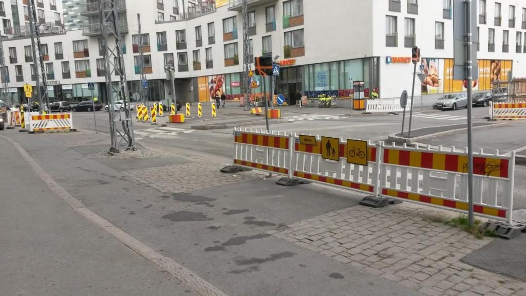 Viime maanantaina Jätkäsaaren suuntaan käveleville ja pyöräileville tuli jälleen uusi lisälenkki: ”Keskustan suunnasta Länsiterminaalille kuljettaessa kiertotie kulkee Laivapojankadun ja Välimerenkadun kautta Tyynenmerenkadulle”. Tällä hetkellä siellä aidataan ilmaa, sillä työmaata ei tuolla suljetulla osuudella ole. Ohjaus suoritetaan perinteisesti kylvämällä lähikorttelit täyteen aitoja ja keltamustia kiertotiemerkkejä sekä kiinnittämällä sinne tänne ei niin kovin loogisiin paikkoihin A4-kokoisia virheellisiä karttoja. Reilun neljän viikon pakkokierto täyttää joidenkin mielestä kulkumuotojen prioriteetit, koska on aidat, merkit ja kartat. Ajoradan kaistoihin ei ole lainkaan koskettu.