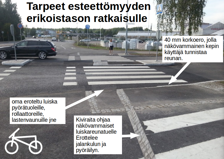 Pyörätuolinkäyttäjille, rollaattoreilla ja laatenvaunuille saadaan tulevaisuudessa esteettömpiä reittejä luiskaamalla kävelytien puolelta osa reunakivestä kauppakeskusten, metroasemien ja aluekeskusten ympäristöissä. Näin vältetään myös pyörätuolien ja pyörien konfliktitilanteet. Tekninen lautakunta hyväksyi ehdotukseni 21.9.2016 (§4) yksimielisesti. Tämä on tarkoitus tehdä heti kun nyt työn suunnittelussa oleva pyöräteiden luiskaus on saatu päätökseen. Taustaksi voi lukea Otso Kivekkään blogin aiheesta. Pieni iso asia esteettömämmän liikkumisen puolesta.