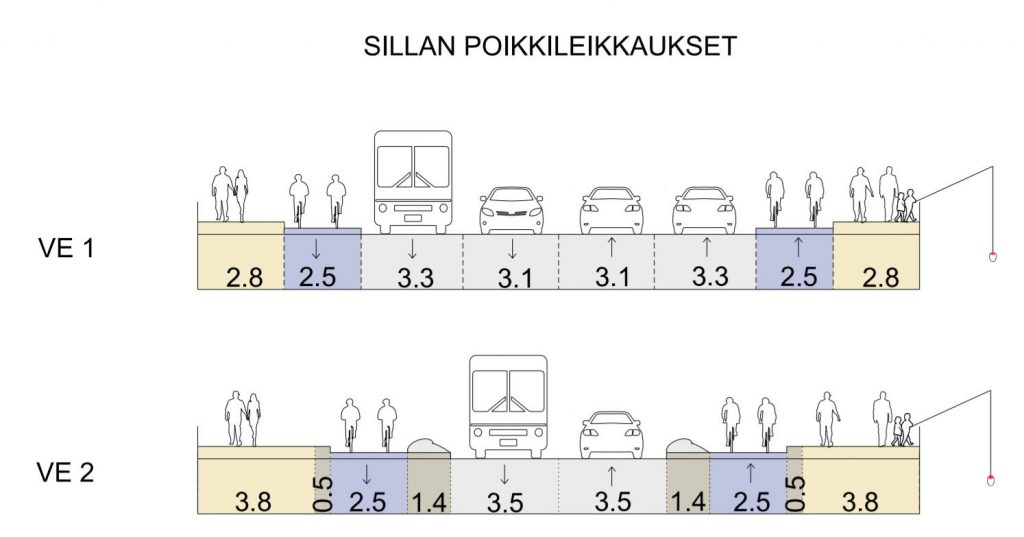 Elokuussa oli esillä kaksi vaihtoehtoa sillan kaistaratkaisusta. Ensimmäisessä vaihtoehdossa sillalla oli 2+2 tavanomaista kapeampaa ajokaistaa, 2,5 m yksisuuntaiset pyörätiet, 2,8 m jalkakäytävät eikä lainkaan lumitilaa.