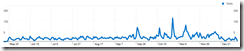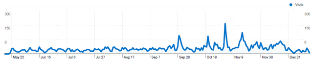 Toukokuun lopusta vuoden 2009 loppuun blogilla on ollut 8674 uniikkia kävijää ja 16376 sivunlatausta. Kävijähuippu saavutettiin marraskuussa, jolloin uniikkeja kävijöitä oli 1275 eli n. 40 päivässä. Kuten kaaviosta näkyy, tiettyinä päivinä kävijämäärissä on ollut isoja piikkejä. Se johtuu varmaankin niihin aikoihin julkaistujen suosittujen viestien lukijoista, jotka ovat seuranneet toisten palveluiden linkkejä blogiin.
