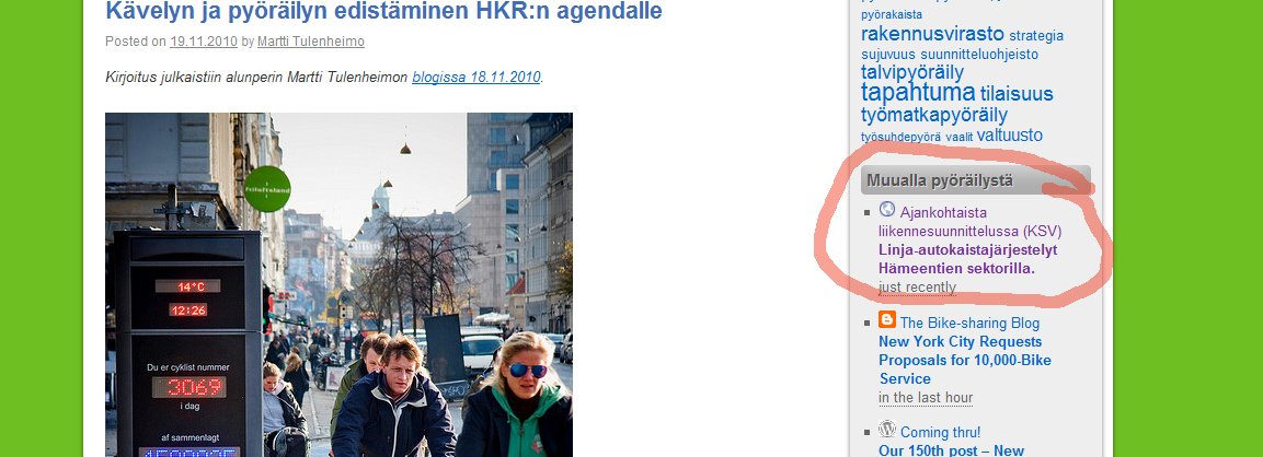 Syöte ei vielä toimi täysin saumattomasti, esim. päivämäärien kanssa on heittoa (scrapperiä voi parannella wikimäisesti ja osallistua keskusteluun teeman ympäriltä), mutta pääasia on, että nyt näemme liikennesuunnittelun viimeisimmät suoraan blogin sivupalkista. Suurkiitos @Ile ja @mikkohei13!!!