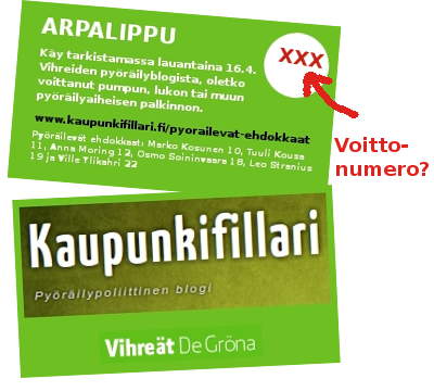 Alkavan viikon aikana saatat saada pyöräsi ohjaustankoon roikkumaan arpalipukkeen, jolla voit voittaa pyöräilyyn liittyviä tavarapalkintoja. Helsingin vihreiden pyöräilytyöryhmä järjestää arpajaiset pyöräilevien ehdokkaiden vaalityön tueksi. Arpajaisiin voi osallistua myös sähköisellä arpalipulla.