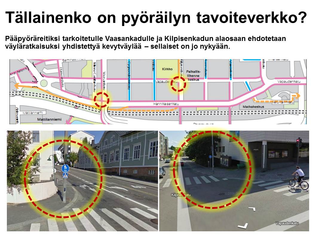 Tavoiteverkossa (1.) Keskustan kehälle toteutetaan pääpyöräreitit (2.). Sujuvin pyöräyhteys saavutetaan kaksisuuntaisella pyöräteillä kehän ulkoreunalla (3.), jossa on vähän kontaktipisteitä ja liittymiä. Erillisen pyörätien toteuttaminen Vaasankadulle ja Kalevankadulle ei kuitenkaan ole tilanpuutteen vuoksi mahdollista (4.). Yliopistonkadulle ja Hannikaisenkadulle kaksisuuntainen pyörätie on pääosin toteutettavissa.