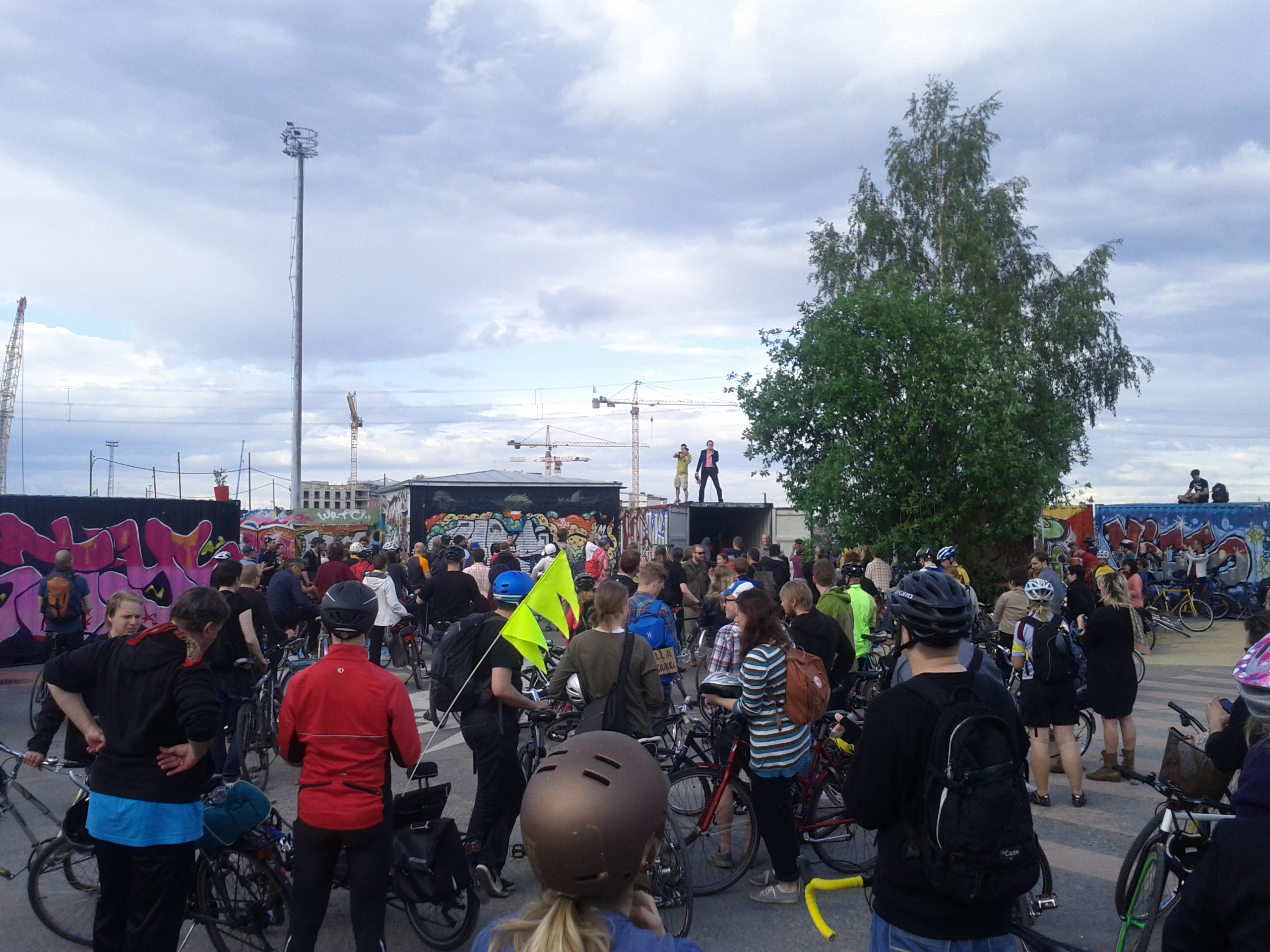 Kesäkuun kriittinen suuntasi tulevaisuuteen: Baanalle joka aukesi, Mechelinninkadulle johon piirretään jo pyöräteitä ja lopulta Kalasatamaan johon rakentuu aivan uutta kaupunkia. Retkelle osallistui 370 pyöräilijää, mikä tekee siitä suurimman Helsingin viime vuosien pyöräkulkueista.