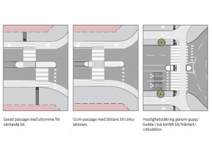 Uusittu liittymä valmistui n. pari vuotta sitten ja sitäkin on arvosteltu usein tapahtuvien pyöräonnettomuuksen johdosta (kahdessa vuodessa kuusi onnettomuutta). Itse usein tuolla pyöräilleenä (vanhaa versiota ei ajanut kertaakaan) uskoisin onnettomuuksien, tai sen pelon, johtuvan lähinnä tukholmailaisille kasvaneesta asenteesta: autoon luotetaan, koska se väistää aina. Mikäli jostain syystä auto ei väistäisikään (Helsingissä perustilanne), tai joutuisi lukkojarruttamaan (Helsingin tämän hetken ”hyvä käytös”), on se jo itsessään ”onnettomuus”, vaikka kukaan ei jäisikään alle. Samaa tukholmalaisasennetta Helsingissä käyttäessä jäisi auton yliajamaksi vartissa – konkreettisesti. Toivottavasti tilastoissakin näkyisi parannus, sillä pyöräilijät lehtikirjoituksen mukaan ovat valittaneet kaupungille vain kahdesti. Myöskään punaista massaa ylityskohtiin ei ole lisätty.