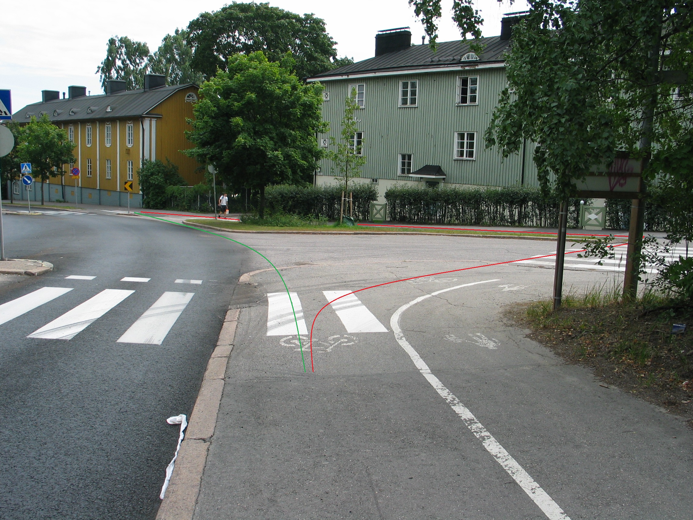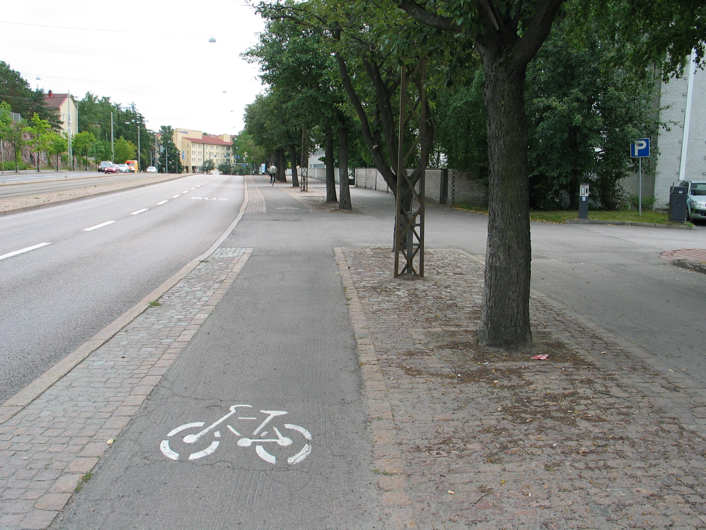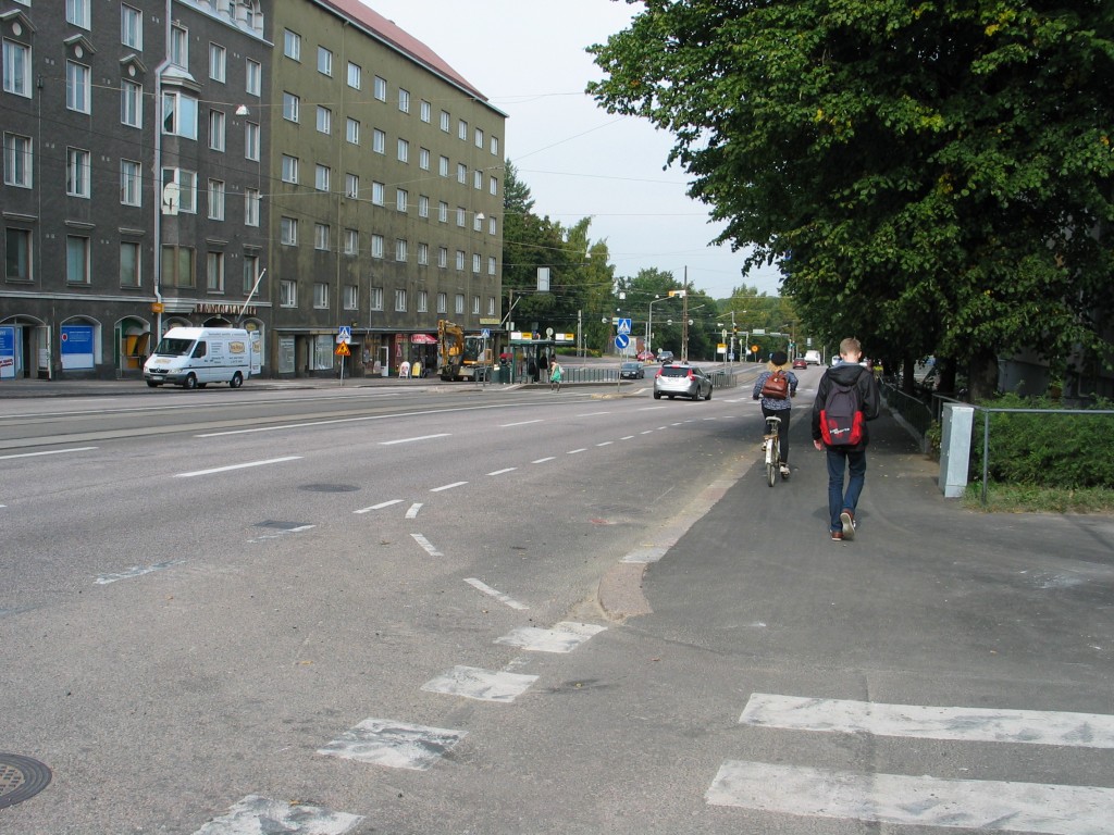 Miksi pitää kadun molemmilla puolilla alimittaista kaksisuuntaista pyöräteitä, kun erittäin kustannustehokkaasti saataisiin huomattavasti joustavampi, turvallisempi ja nykykapasiteetin puitteet kestävä kohtalaisen hyvä yksisuuntainen pyörätie. Tarvitaan vain valkoista massaviivaa ja tiemerkintöjä: pyörän kuvia ja ajosuuntanuolia. Siirtymäkohdat sekaliikenteestä pyörätielle ja pyörätieltä sekaliikenteeseen hoituvat edullisesti asfalttiviisteiden ja pyöräilijöistä varoittavien liikennemerkkien avulla, sekä lyhyillä pyöräkaistan pätkillä. Lisäksi erotteluviivan paikkaa on syytä muuttaa, mikäli se ei vastaa tarvetta: harvoin keskellä on hyvä, jalankulku- ja pyöräilymäärien suhde siirtää viivan paikkaa, mutta oli jalkakäytävä kuinka leveä tahansa, pyöräväylä kannattaa pitää kohtalaisen tasalevyisenä. Näin korjattuna verkko olisi selvästi nykyistä parempi, sillä juuri yksisuuntaisuus mahdollistaisi nykyisen katkeilevan verkon jatkuvuuden.