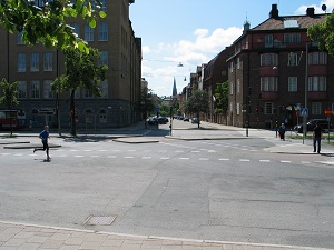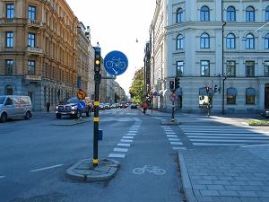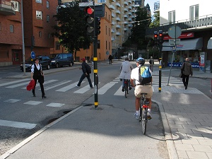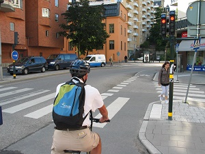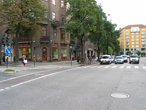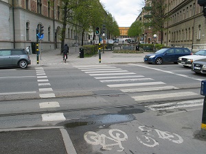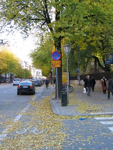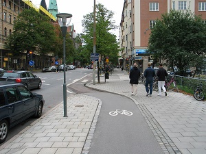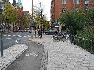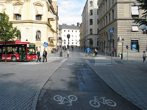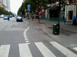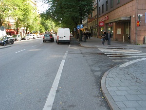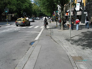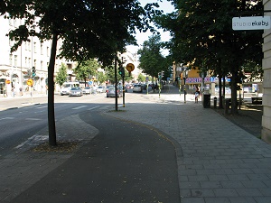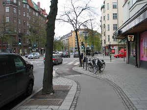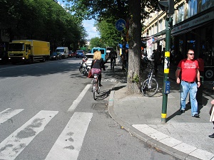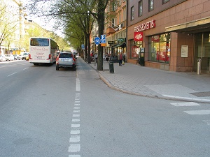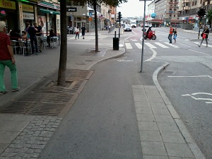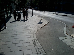 Tietenkin Tukholmassa asiaa helpottaa vielä laatoitetut jalkakäytävät, jotka viestivät kävelytilan hyvin, myös näkövammaisille sekä jalkakäytävälle aikoville pyörille.
