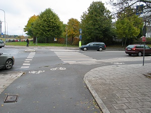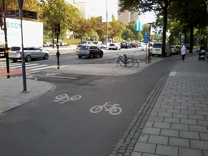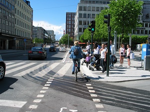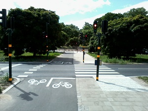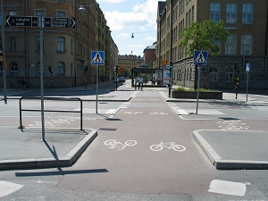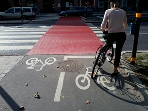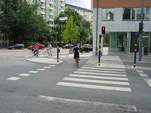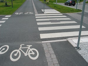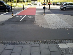 Kolmas ryhmä, pyöräilijät, kulkevat risteyksien välissä lähellä kahta edellistä ryhmää, mutta välissä on aina noppakiveys (3-6 riviä), nupukiveys (min. 2 riviä), reunakivi (ns. kolmitaso) tai massaviiva (jopa 4mm paksu). Mutta risteysalueilla erottelu on aina rakenteellinen (pituussuuntainen tasoeroteltu reunakivi). Rakenteellinen erottelu pitää olla niin hyvä, että missään tilanteessa pyörätielle ei voi kukaan tietämättään eksyä (oletetaan kuitenkin, että reitit ovat jo ennestään hieman tuttuja). Kun nämä asiat on kunnossa, niin pyörätie voidaan rakentaa ajoradan tapaan täysin sileänä.