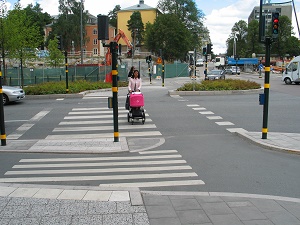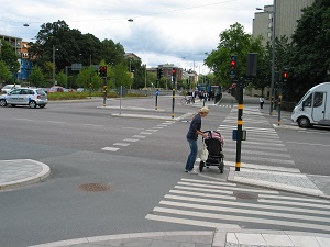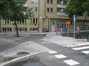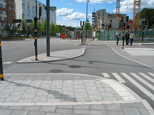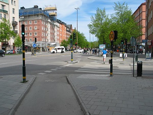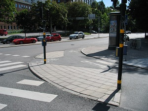 Risteysalueilla liikkuu myös toinen yhtä tärkeä – mutta huomattavasti runsaslukuisempi – liikkujaryhmä, esteettömyyttä tarvitsevat. Nämä rollaattori, pyörätuoli, lastenvaunu ihmiset tarvitsevat nolla tasoisia luiskia. Tukholmassa nämä luiskat on toteutettu siten, että esteettömyyttä tarvitsevat näkevät itse omat luiskansa, mitä käyttävät, ja näkövammaisia ei milloinkaan opasteta niihin. Siis vain näkövammaisille on tehty pesubetoniset lähestymislaatat ja reunaan valkoinen huomiolaatta 30-40mm reunakivellä. Lisäksi näkövammaisten ratkaisut ovat loogisesti suoraan jatkuvalla reitillä, toisin kuin luiskat ovat usein hieman tästä reitistä sivussa. Ja mikäli pyöräväylä kulkee vieressä, esteettömät on poikkeuksetta sijoitettu pyöräilyn ja näkövammaisten väliin toimimaan lisäsuojana.