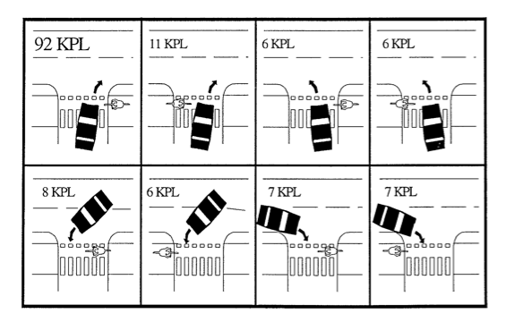 Oikealle kääntyvän auton ongelma korostuu onnettomuustilastoissa. Lähde: Pasanen & Räsänen 1999.