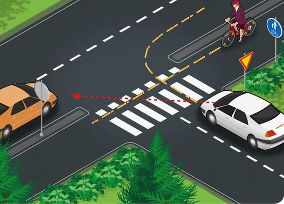 Kun pyöräilijä ajaa tien oikealla puolella, oikealle kääntyvän auton ongelma katoaa. Kuva: Liikenneturva/kirjoittajan muokkaama