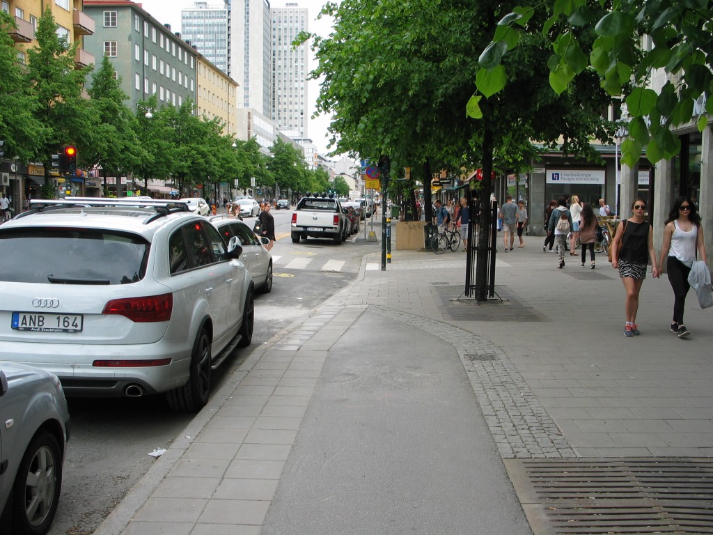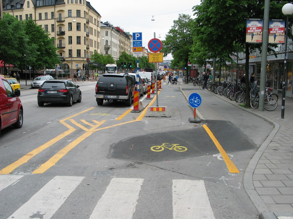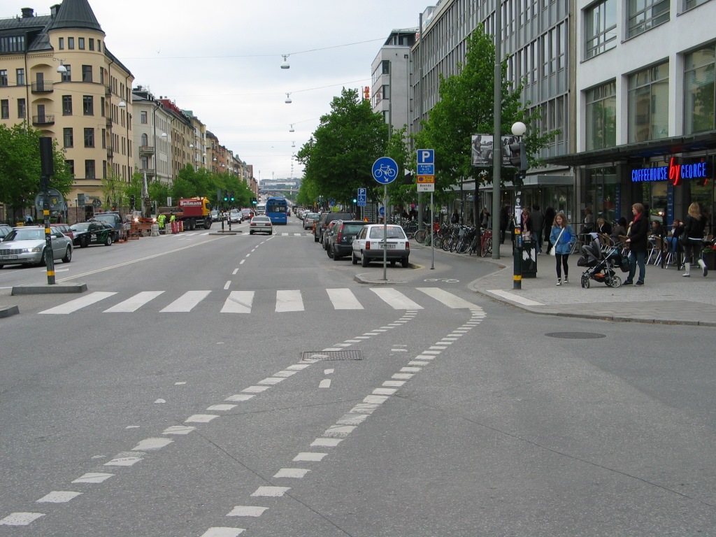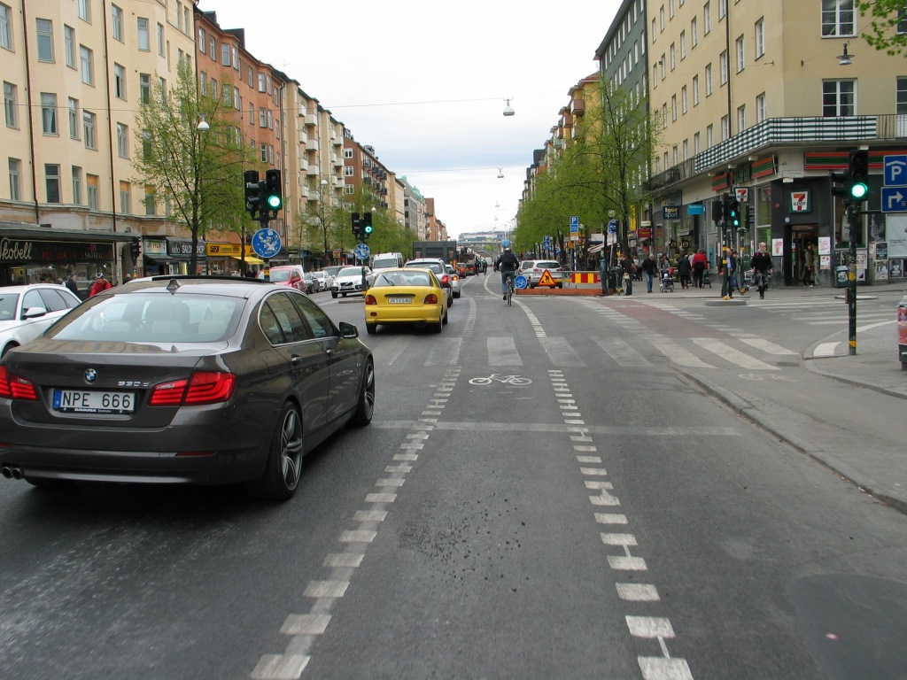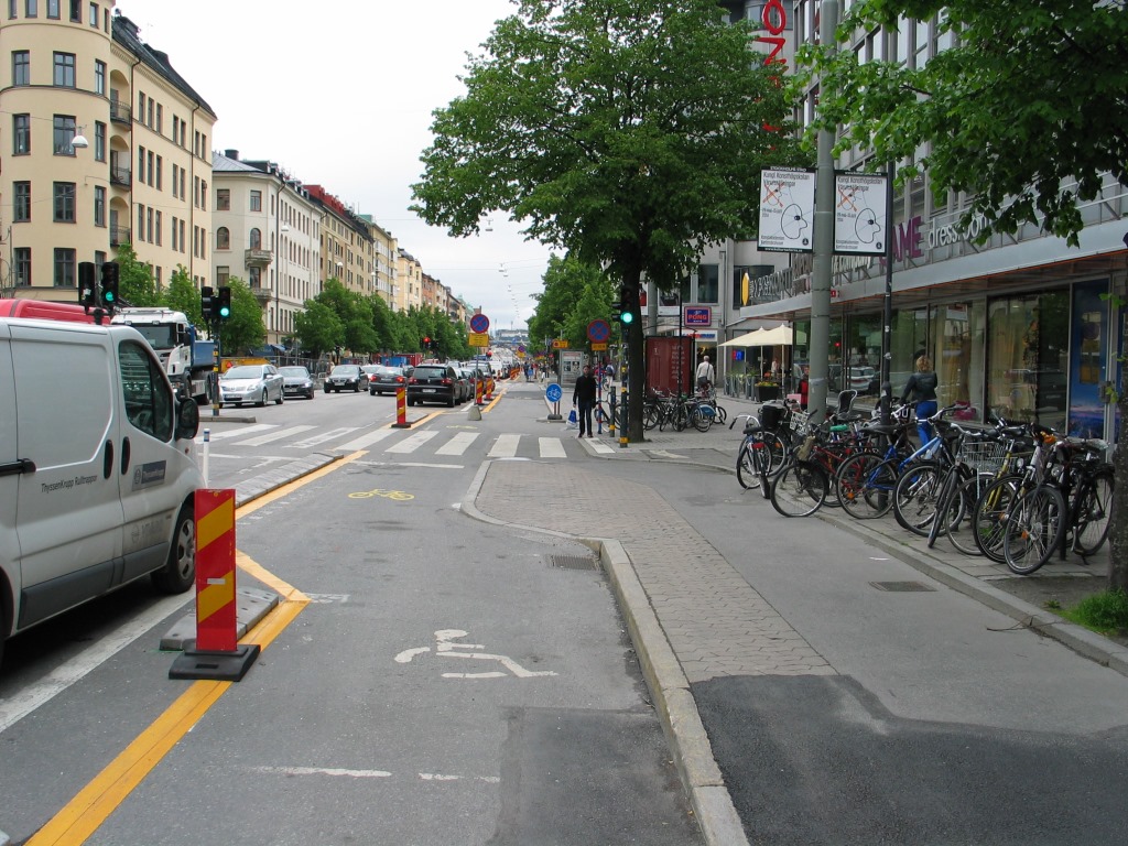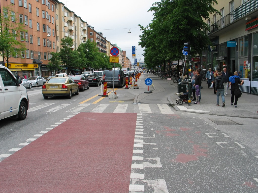 Hieman ihmetyttää näin kevyesti massalla muutettu katu, kun saman saaren toinen pääkatu Hornsgatan valmistui hiljattain ja se näyttää edelleen samalta, mitä Tukholmaan on viimeisen viidentoista vuoden aikana tehty. Hornsgatanillakin poistui periaatteessa yksi kaista, kaista joka oli käytössä korttelin matkalla molempiin suuntiin vasemmalle kääntyvien kaistana. Siellä pyöräkaista tehtiin uudelleen pysäköityjen autojen liikenteen puolelle. Joka on ihan toimiva ratkaisu siellä. Nähtäväksi jää, onko tämä jotain uutta suunnittelufilosofiaa, vai ainoastaan pikaratkaisu edullisella budjetilla. Joka tapauksessa tällä muutoksella katutilan jako on asteen verran tasa-arvoisempi, ja tämän myötä yliruuhkainen pyöräväylä toimii taas hetken. Rohkea teko oli poistaa puolet henkilöautojen kaistoista. Hyvä Tukholma! Ainoastaan näin voidaan saada mukavampaa ja hauskempaa kaupunkitilaa. Ja tekotapa, tykkään.