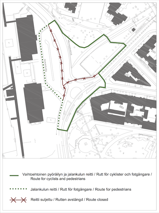 Kiertotiejärjestelyiden tulee olla loogisia, yksinkertaisia ja selkeästi opastettuja. Kuvan esimerkki Olympiaterminaalin työmaan kiertotiestä ei täytä mitään näistä kriteereistä.