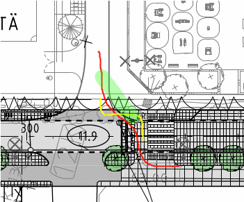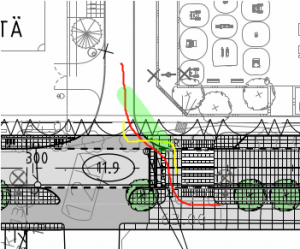 Näin tuskin suurin osa pyöräilijöistä tekee, vaan oikaisevat viistosti ajoradan kautta (punainen viiva). Risteys selkeytyisi, jos korotettua pyörätienjatketta vietäisiin hieman, ehkä metrin, pohjoisemmaksi tai Tapionkentän läpi kulkevan ajoradan eteläreunaa viistottaisiin.(vihreä viiva)