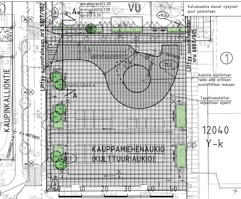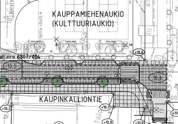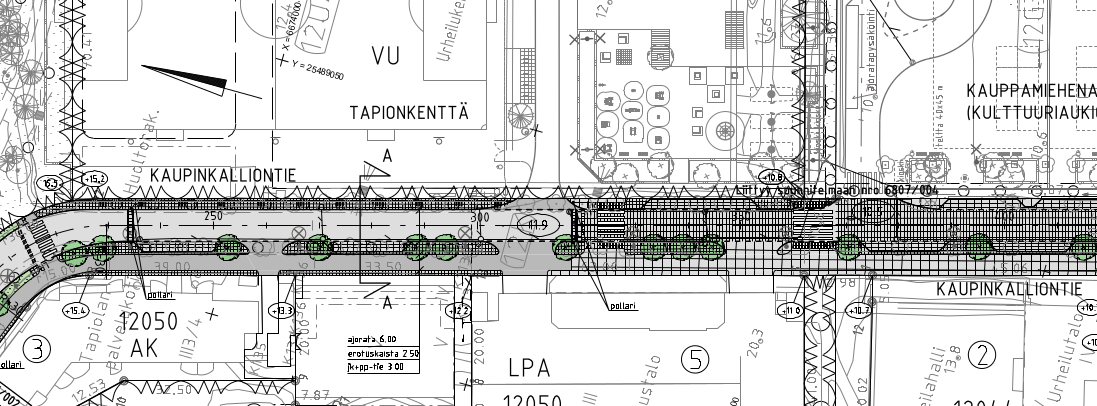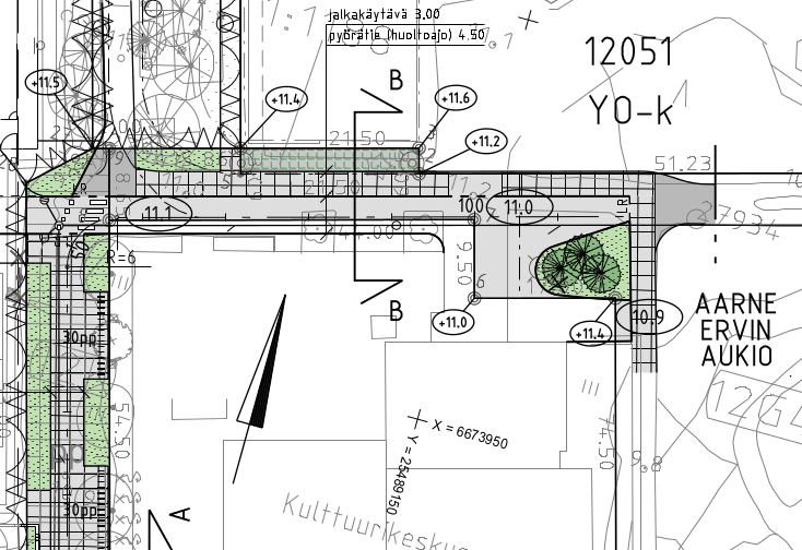 Kauppamiehenaukion kohdalle ei ole merkitty Kaupinkalliontien yli yhtään pyörätienjatketta, vaikka aukion puolelle oli suunnitteilla pyöräpysäköintejä.