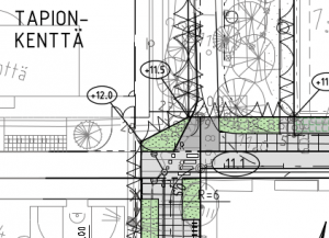 Kulttuurikeskuksen ja Tapionkentän välissä olevan pyöräilyn ja huoltoliikenteelle tarkoitetun ajoradan ylittävä suojatie on tehty vinoon.