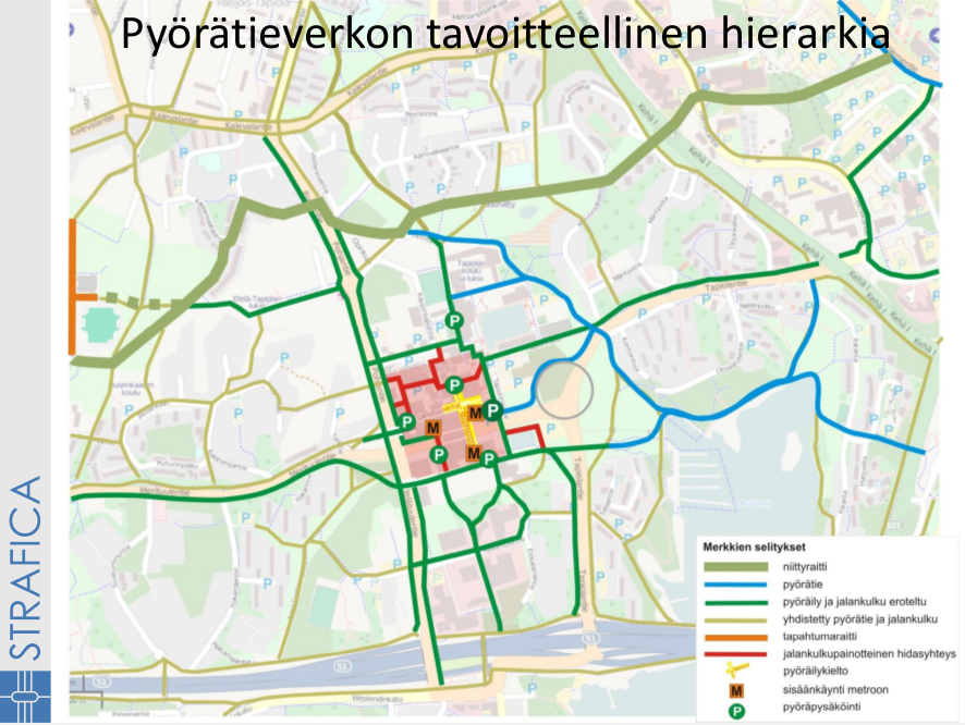 Strafican suunnitelmassa Kulttuurikeskuksen eteen oli sijoitettu visuaalisesti eroteltu pyörätie. Seutureitin tarkoituksena on ohjata pyöräilijävirrat Tapiolan keskustan ohi pohjoispuolelta. Jotta tämä toimisi, tulee opastuksen olla nykyistä huomattavasti selkeämpi. Samoin tämän vain pyöräilylle ja huoltoliikenteelle varatun ajoradan tulee olla selkeästi erilainen, jotta kävelijät eivät harhaudu sinne. Selkeintä voisi olla, että Kauppamiehentieltä tuleva pyöräreitti toteutettaisiin punaisella asfaltilla, jolloin se olisi sekä visuaalisesti erottuva että ohjaisi pyöräilijät halutulle reitille. Punainen asfaltti on jo yleisessä käytössä Helsingissä vastaavissa paikoissa.