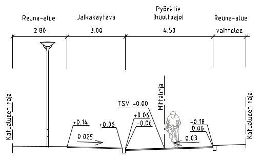 Reitti on Espoon seutureitti, jonka tulee olla 2+2 eroteltu jk+pp.  Nyt merkitty 3 m leveä jk+pp  190-444, plv 110-190, ja Opintie plv 34-110. Välikaista on 2,5 m, joten kavennusvaraa löytynee? Näin keskeinen yhteys täytyy olla eroteltu, mikä todetaan lähtökohtaisesti Strafican selvityksessä.