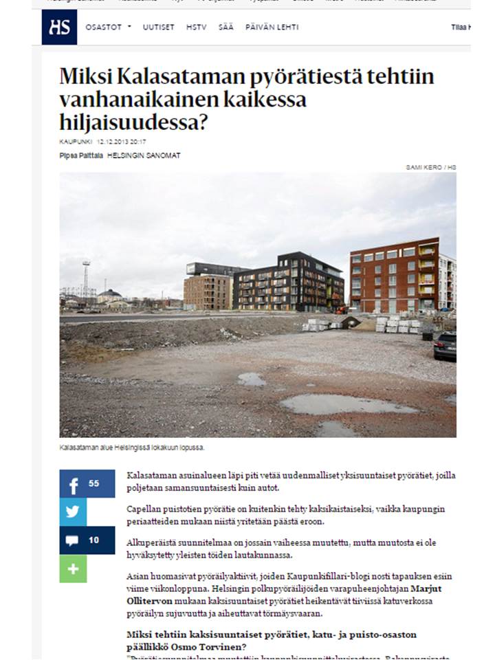 Joka tapauksessa Kalasatamassa kyse oli siitä, onko järkevä – tai edes luvallista – rakentaa kaupunkisuunnittelulautakunnassa hyväksytyn vuoden 2012 Pyöräliikenteen suunnitteluohjeen ideologian ja ohjeiden vastaisesti vanhanaikaisia pyöräteitä puolitoista vuotta myöhemmin syksyllä 2013 vain sen takia, koska suunnitelmat oli tehty ja hyväksytty ennen uuden suunnitteluohjeen lautakunnassa hyväksymistä. Luulisi, että suunnitteluohjeen hyväksymisen jälkeen kaikkea ei-rakennettua verrattaisiin ohjeeseen, ja tarvittavat muutokset tehtäisiin itsestään ilman erillistä vaatimusta ja suurta julkisuutta. Niinhän sitä luulisi.