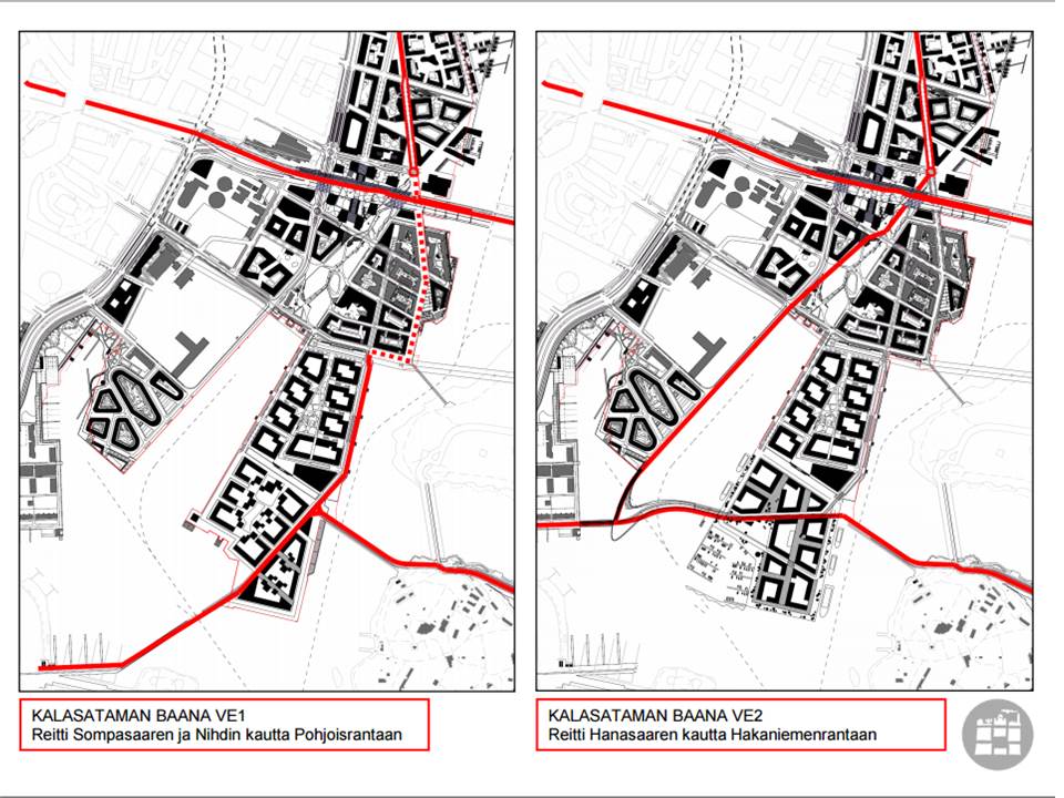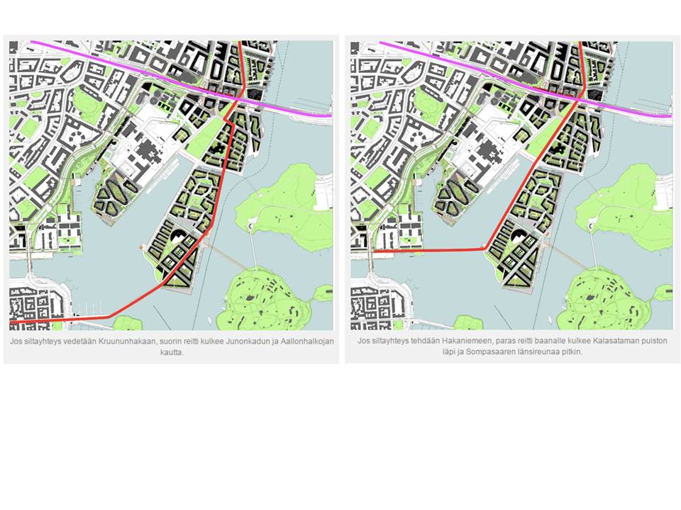 Viime tiistain kokouksessa esiteltiin ja hyväksyttiin myös baanojen tavoitelinjaukset molemmissa vaihtoehdoissa: silta Hakaniemeen vai silta Kruununhakaan.