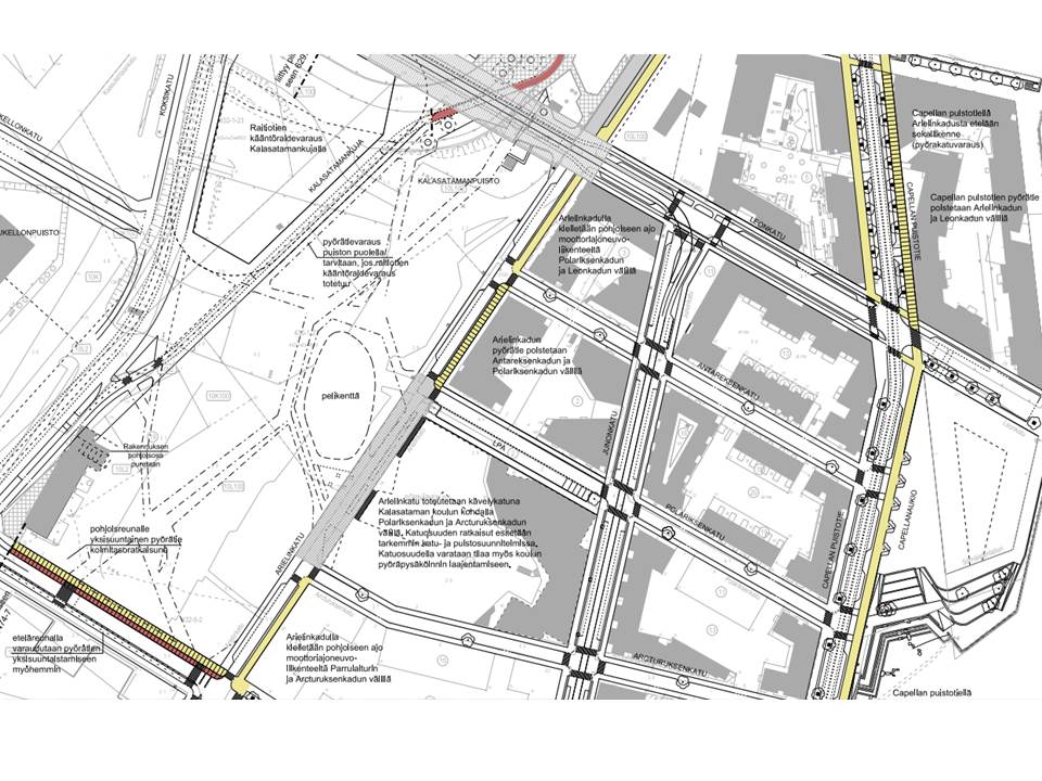 Pyöräilyolosuhteita selkeytetään ja tulevan pyöräbaanan mahdolliseen reittimuutokseen varaudutaan. Rakenteilla olevan koulun ja tulevan puiston välinen katualue rauhoitetaan autoliikenteeltä. Lähde: samainen asiakirja