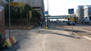 Lisäys. Lisätty video 6.4. klo 18:59 Pasilan virastokeskuksen edestä, missä kulkee tällä hetkellä eroteltu jalkakäytävä ja pyörätie.
