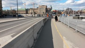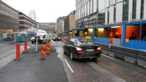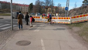 Tukholmassa asioita on tapana ratkaista näin! Vasemmassa kuvassa pyöräily on sekaliikenteessä (saapuvat työmaan kohdalle molemmista suunnista yksisuuntaisesti pyörätietä ja -kaistaa pitkin) ja kävely molemmin puolin katua. Oikeassa kuvassa pyöräily ja kävely omalla väylällään. Vain siirrettävä tunnistimella varustettu liikennevalo on nostettu pyörätielle, vaikka sekin voisi aivan hyvin olla ajoradalla.