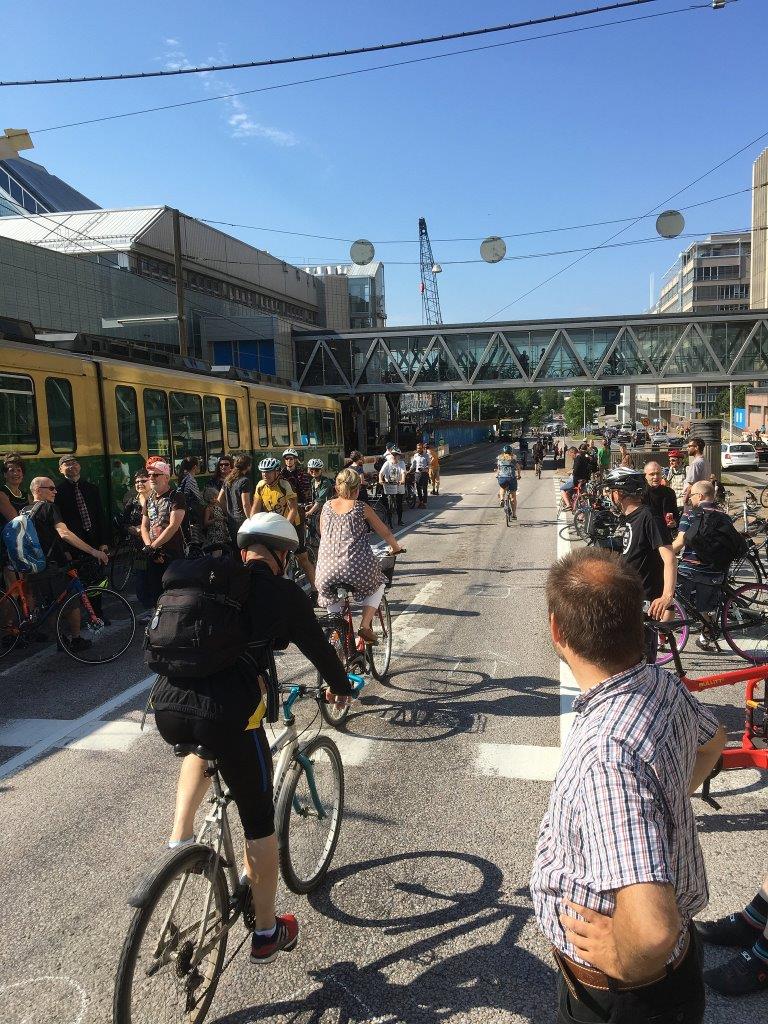 Junan ja ratikan väliä matkaavia riittää. Keskisuojatielle tuli hetkessä kymmenittäin uusia kävelijöitä. Kävelijöiden 80 metrin matka vaihtui takaisin 260 metriin. Kävelymatkan pituus yli kolminkertaistui. Myös pyöräilyn pop-up -pyörätie muuttui käyttökelvottomaksi, sillä alhaalla mielenosoitusta rajannut poliisipartio oli noussut jo puolirinteeseen. Nyt tilanne oli muuttunut iloisista ohikulkevista pyöräilijöistä kadunvaltaukseksi. Kadulla ei voinut tehdä enää muuta kuin istua ja keskustella. Hyvä, helppo ja turvallinen tilapäisreitti on vaihtunut takaisin ahtaisiin odotustiloihin, liikennevaloissa seisoskeluun, reunakiviin, vaaralliseen ja kapeaan ränniin sekä hissistä eteen astuviin ja luvattomasti pyörätiellä käveleviin ihmisiin.