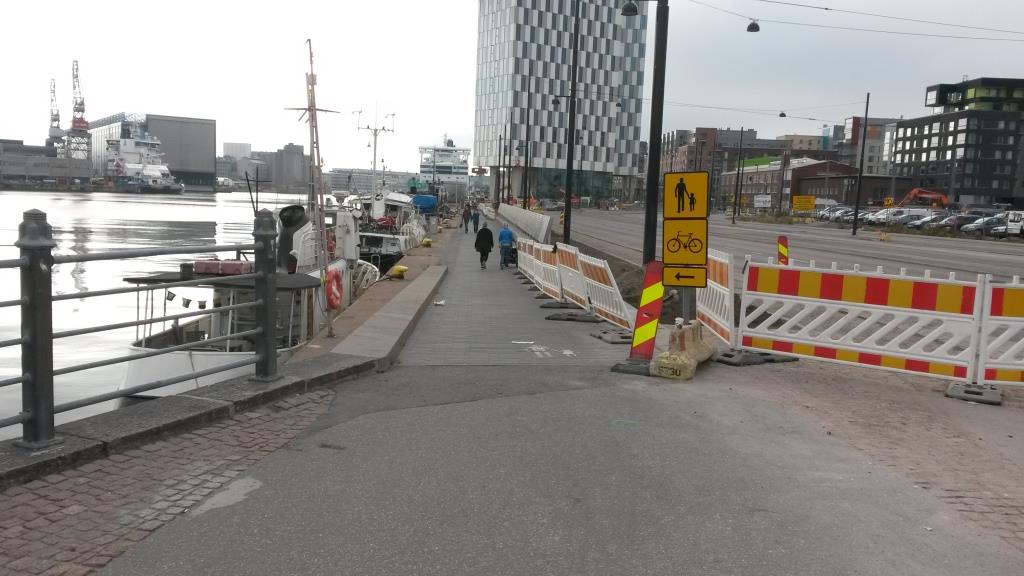 Jätkäsaarenlaiturilla oleva pyöräilyn poikkeusreitti on aivan yhtä surullinen. Paikassa, missä ihmiset kävelevät rauhassa – suorastaan viipyilevät ja ihailevat maisemia, on sinne kaupungin toimesta päätetty työntää myös kaksisuuntainen pyöräily. Ja koska pyöräily on nyt muka huomioitu, ei varsinaista pyörätietä ole mikään kiire saada valmiiksi. Tiedoksi virkamiehille: viralliselta pyörätieltä puuttuu edelleen ainoastaan asfaltti, minkä jälkeen se olisi valmis. Puolen päivän työ.