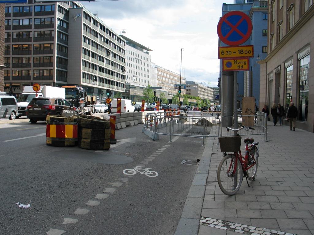 Hotellin työmaa-alueen rajat ovat pysyviä, mutta laivoilta purkavan rekkaliikenteen takia pyöräilijöiden vaaratilanteet ovat silti päivittäisiä. Yksisuuntainen pyöräily oli onneksi päätetty pitää samalla puolella katua, mikä onkin yksisuuntaisen pyöräliikenteen poikkeusjärjestelyiden helppous, mutta erottelu muusta liikenteestä kevyillä sulkutolpilla ei täällä enää toimi. Raskas liikenne vaatii raskaan erottelun. Sulkutolppien heikkous on myös niiden helppo liikuttelu, joka tällä työmaalla oli päivittäistä: liian usein sulkutolpan ja työmaan välistä ei mahtunut pyöräilemään, vaikka se oli juuri tarkoitus. Samoin raskas liikenne jyräsi sulkutolppia päivittäin. Ongelmista ja vaaratilanteista huolimatta erottelutapaa ei ymmärretty vaihtaa.