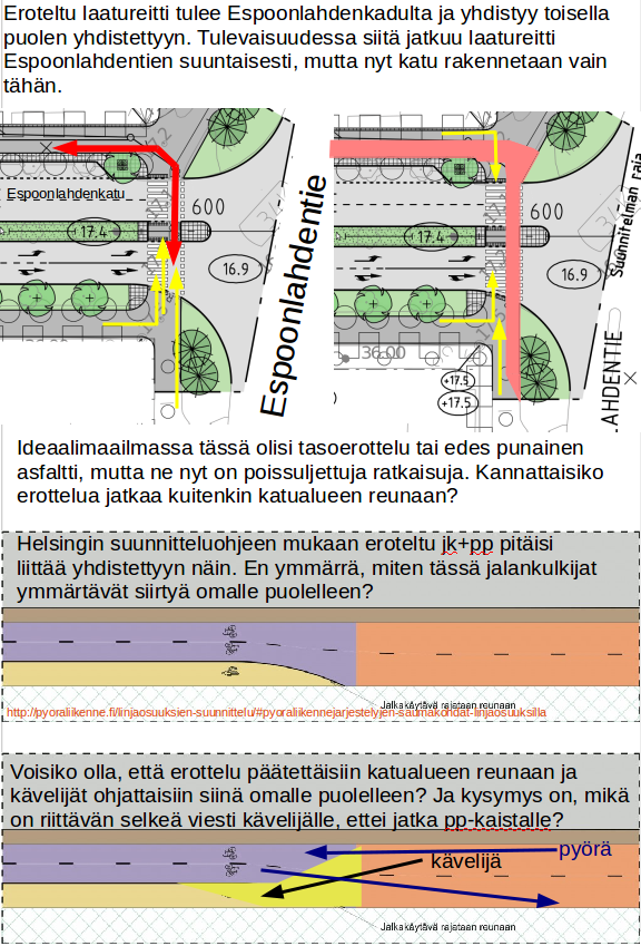 Espoonlahdentien ja -kadun risteyksessä eroteltu laatureitti muuttui katusuunnitelmassa yhdistetyksi risteysalueella, jolloin kävelijät ja pyöräilijät ohjataan törmäyskurssille suojatiellä. Tämä oli erityisen hankala tapaus. Helsingin suunnitteluohjeissa todetaan, että tällaisia epäselviä tilanteita tulee välttää (Yhdistettyjen ja eroteltujen pyörätiejärjestelyjen saumakohdat risteyksissä).