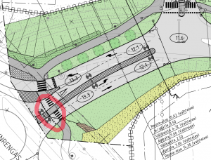 Viherlaaksontorin ja Kievarinraitin katusuunnitelmaan lisättiin ehdotuksestani erottelu Kievarinraitille. Perusteluissa vetosin HSL:n 2012 ohjeisiin, joissa todetaan aluekeskuksista: Näissä ympäristöissä on paljon pyöräilyä ja jalankulkua, jolloin keskeiseksi nousee turvallisuuden varmistaminen selkeällä erottelulla. Tässä lisäys oli helppoa, koska tilaa riitti: Kievarinraitti on 4,5 m leveä, joten siihen mahtui 2+2,5 m jk+pp. Näin kävelijöiden ja pyöräilijöiden kokema turvallisuus parani merkittävästi.