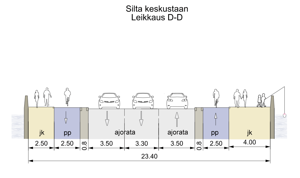 Elokuussa oli esillä kaksi vaihtoehtoa sillan kaistaratkaisusta. Ensimmäisessä vaihtoehdossa sillalla oli 2+2 tavanomaista kapeampaa ajokaistaa, 2,5 m yksisuuntaiset pyörätiet, 2,8 m jalkakäytävät eikä lainkaan lumitilaa.