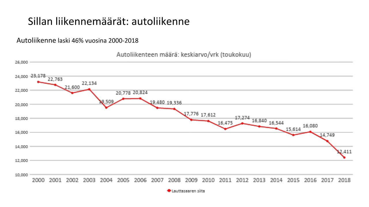 Autoliikenteen määrät Lauttasaaren sillalla ovat laskussa